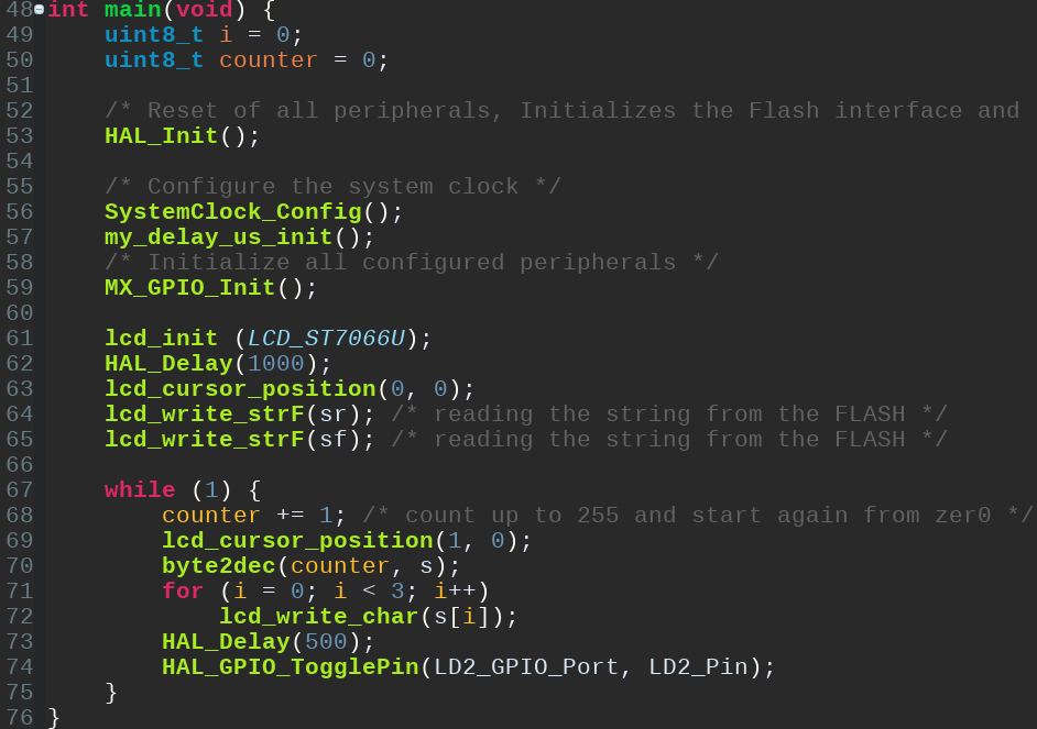 The application is a “Hello World” type, testing the functionality of the library, with the main function looking like in the following screen capture: