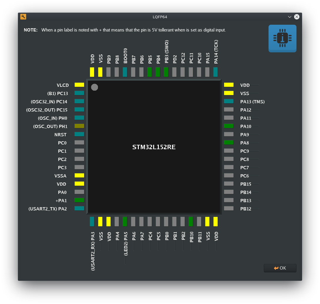 The pads of LQFP64 package will show the actual status by changing their own colors. Is not much right now, but combined with all the program has to offer, is infinitely better than what CubeMX for STM8 microcontrollers offers. The following image shows the pin setup of the l152_single_ds18b20 project, where 6 pins are set for LCD4 peripheral and PA1 is set as ONEWIRE bus (in the previous article you have another image to compare with):